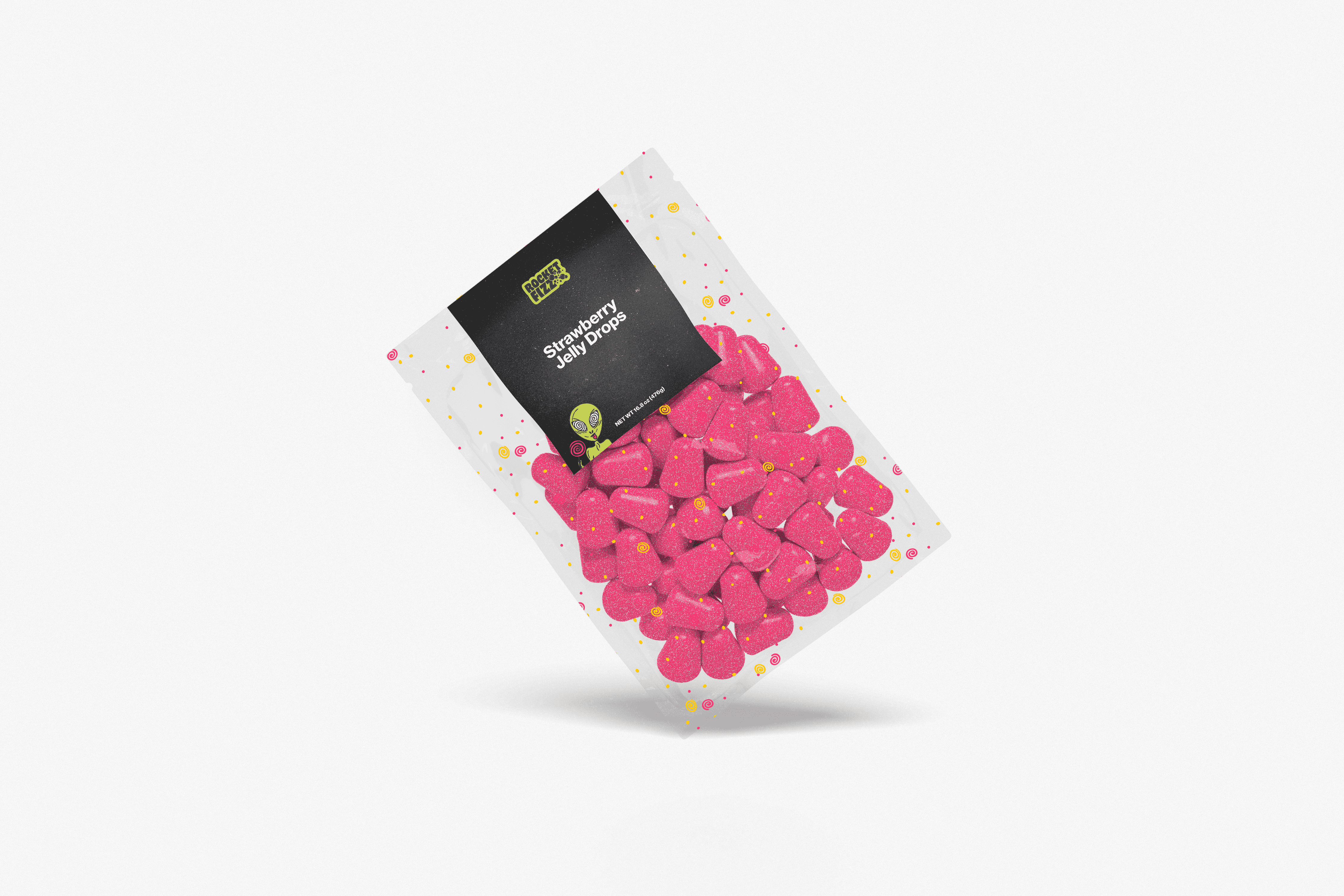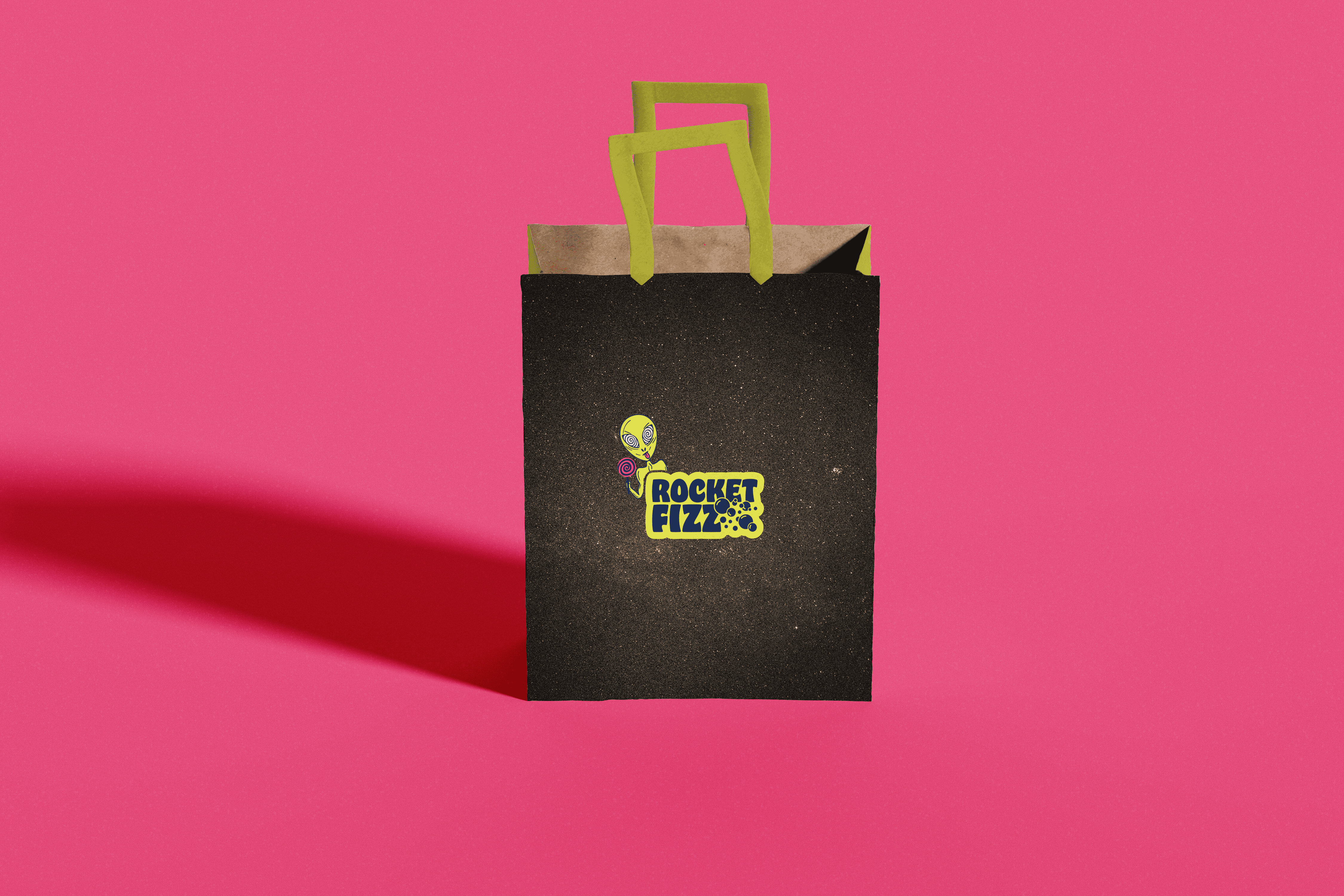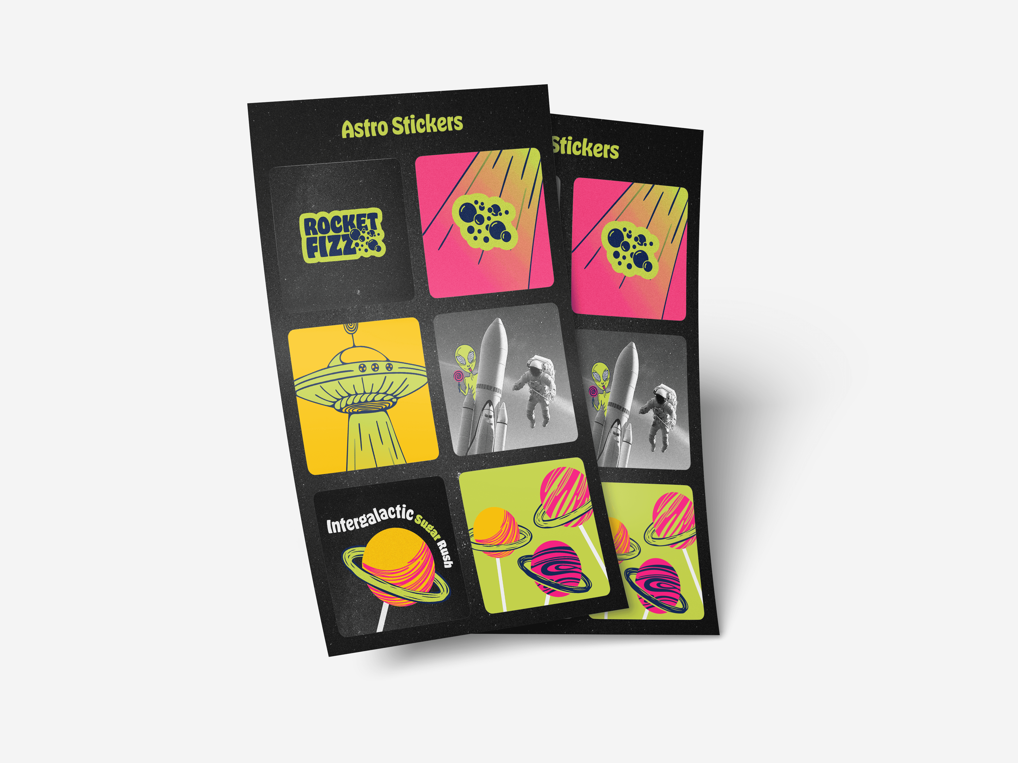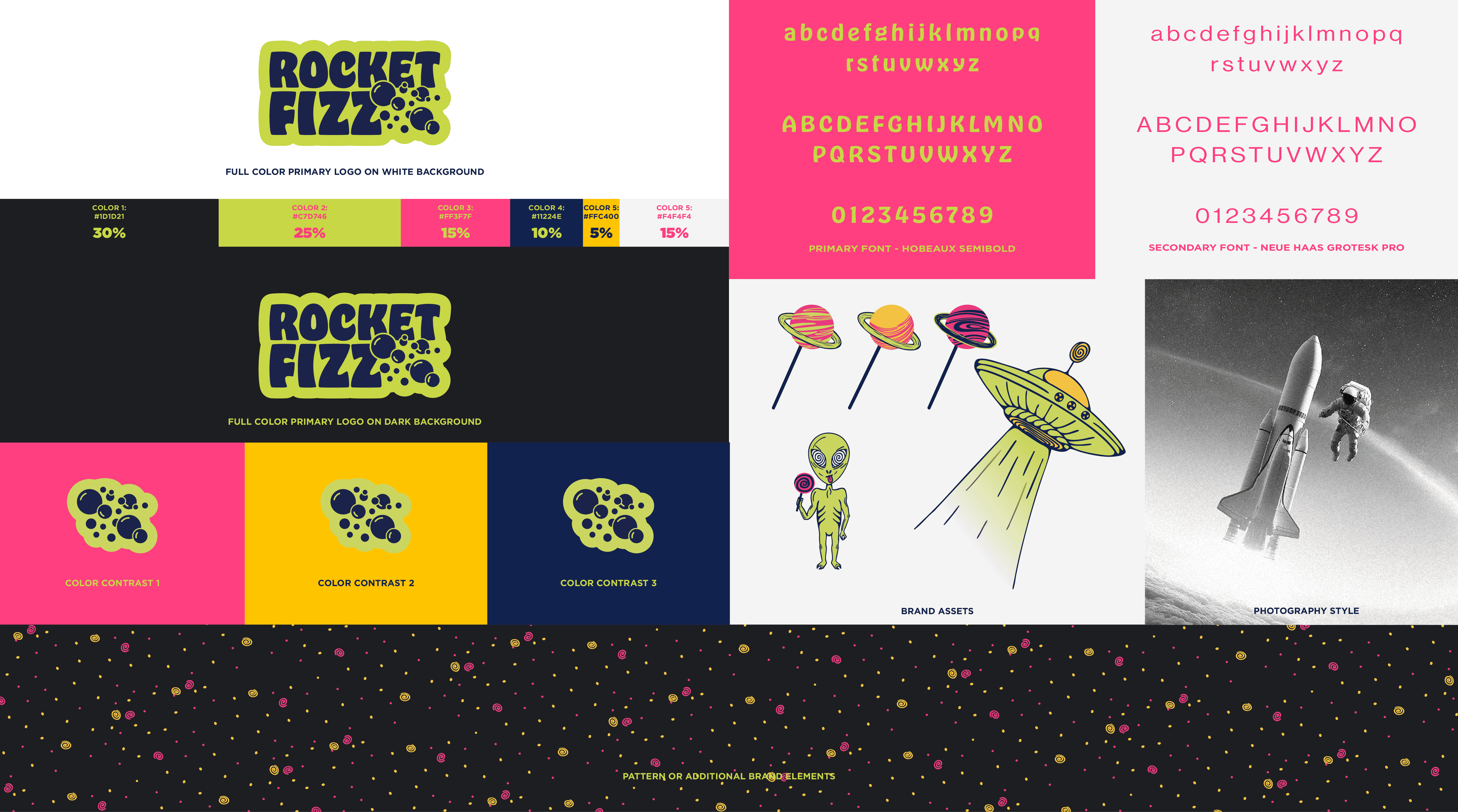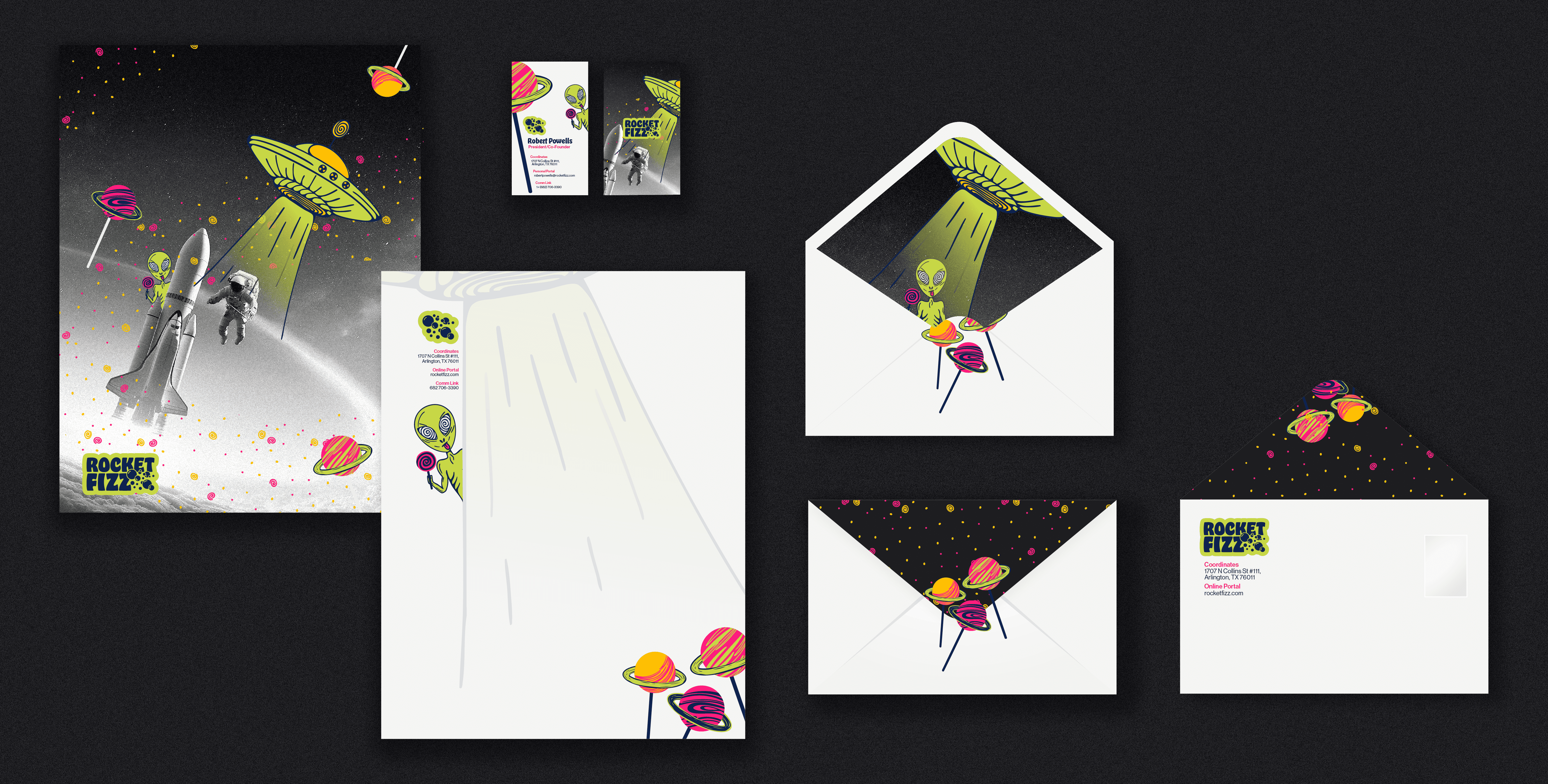 Rocket Fizz is an American franchise known for its novelty sodas and expansive candy selection, including its own line of uniquely flavored soft drinks and candy. The visual direction pushes into bold, over-the-top territory, evolving the brand’s astronaut roots into an intergalactic alien takeover. Brand assets build a narrative around a candy-crazed alien navigating candified planets and spacecraft, constantly searching for its next sugar rush. Hypnotic spiral patterns evoke cosmic “space dust,” while photo treatments place the brand in orbit and shift the energy to the candy-loving alien.